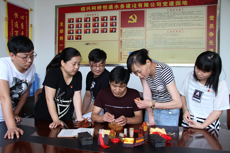 為進一步推進兩學一做學習教育,日前,恒通水務建設公司黨支部組織黨員以黨在人民心中為主題進行書法、篆刻創作,廣泛地吸引了黨員干部參與。圖為公司職工金偉勇在向黨員們傳授篆刻的竅門。
